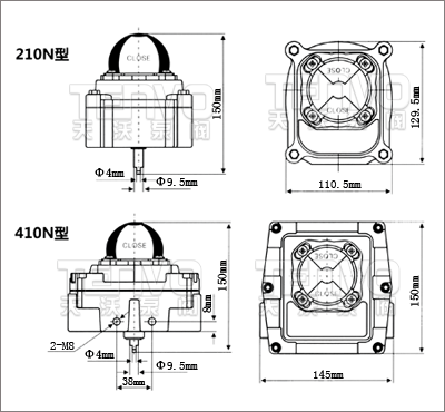 APL-210N和APL-410N型限位開關(guān)傳送執(zhí)行器和閥門的位置訊號到現(xiàn)場和遙控操作站。它能直接安裝在執(zhí)行器上部,符合標準VDI/VDE3845。特點有現(xiàn)場可視位置指示器,快速調(diào)整位置凸輪;可調(diào)式凸輪通過花鍵和彈簧安裝,只要開關(guān)凸輪脫離花鍵便可旋轉(zhuǎn)調(diào)整所需的位置,拆掉外殼螺釘和兩個電纜進口G1/2″管接口。內(nèi)部行程開關(guān)預先連接接線終端,8個接線端子,并可用于電磁閥的鏈接。