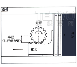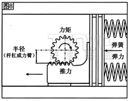 在彈簧復(fù)位的應(yīng)用中,輸出力矩是在兩個不同的操作過程中所得,(如圖7和8所示)。根據(jù)行程位置(0。和90。),每一次操作產(chǎn)生兩個不同的矩值。彈簧復(fù)位執(zhí)行機(jī).構(gòu)的輸出力矩由力(空氣壓力或彈簧作用力)乘上力臂所得。