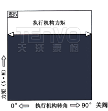 齒輪條式執(zhí)行機(jī)構(gòu)的輸出力矩是活塞壓力(氣源壓力所供)乘上節(jié)圓半徑(力臂)所得,如圖4所示,且磨擦阻力小效率高。如圖5所示。順時針旋轉(zhuǎn)和逆時針旋轉(zhuǎn)時輸出力矩都是線性的。