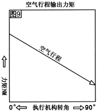 第一種狀況(見圖7):輸出力矩是由空氣壓力進(jìn)入中腔壓縮彈簧后所得,稱為”空氣行程輸出力矩”在這種情況下,氣源壓力迫使活塞從0°轉(zhuǎn)向90°位置,由于彈簧壓縮產(chǎn)生反作用力,力矩從起點(diǎn)時最大值逐漸遞減直到90°為止。(見圖9)