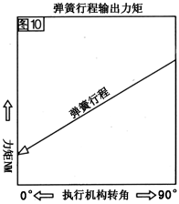 第二種狀況(見圖8):輸出力矩是當(dāng)中腔失氣時彈簧恢復(fù)力作用在活塞上所得,稱為“彈簧行程輸出力矩”,在這種情況下,由于彈簧的伸長,輸出力矩從90°逐漸遞減到0°(見圖10)。