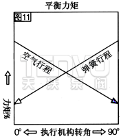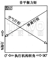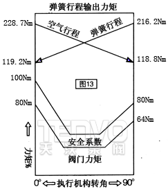 如以上所述,單作用執(zhí)行機(jī)構(gòu)是根據(jù)在兩種狀況下產(chǎn)生一個平衡力矩的基礎(chǔ)上設(shè)計(jì)而成的。如圖11所示。在每種情況下,通過改變每邊彈簧數(shù)量和氣源壓力的關(guān)系(如每邊2根彈簧和5.5巴氣源或反之),有可能獲得不平衡力矩如圖12所示。