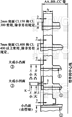 ASME B16.5-2003《管法蘭及法蘭管件》標(biāo)準(zhǔn)中CL150~CL2500端法蘭密封面和它們與法蘭厚度及中心至端和端至端尺寸之間的關(guān)系如圖所示。