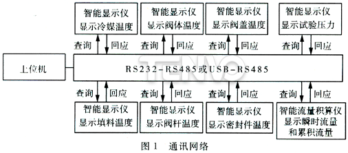 根據(jù)閥門低溫試驗相關(guān)標(biāo)準(zhǔn),試驗過程需要對多個參數(shù)進(jìn)行集中測控,為此采用現(xiàn)場總線式網(wǎng)絡(luò)連接各個硬件設(shè)備。現(xiàn)場總線有很多種,具體的總線模式跟監(jiān)視單元和控制單元的硬件設(shè)備選型有關(guān)。由于在滿足閥門低溫試驗要求的前提下選用智能儀表,其性價比最高,而市面上大部分智能儀表都是利用串行口通信,所以選擇RS-485總線網(wǎng)絡(luò)非常合適。