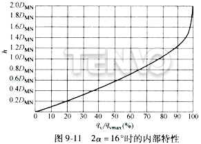 圖9.11所示為閥瓣錐角2α為16°時(shí)的內(nèi)部特性曲線(xiàn),從圖中可以看出,當(dāng)開(kāi)啟高度h=1.4DMN時(shí),調(diào)節(jié)的流量qv為最大流量qvmax的95%,如果繼續(xù)開(kāi)啟時(shí),對(duì)調(diào)節(jié)性能來(lái)說(shuō)已經(jīng)沒(méi)有多大意義了。
