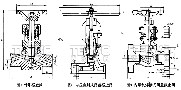 10、螺紋焊接式閥蓋截止閥。這種焊接截止閥的閥體與閥蓋為螺紋聯(lián)接,然后再用焊接密封。保證閥體與閥蓋的連接處絕無外漏。該種結(jié)構(gòu)多使用于APl602、CL800、C L1500、公稱尺寸1 5~50mm的鍛鋼閥門,主要應(yīng)用于石化和電力行業(yè),如圖9所示。