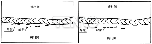 在確認(rèn)閥門和管材均為合格產(chǎn)品后,根據(jù)工程進(jìn)度安排,對(duì)管材和閥門進(jìn)行了組對(duì)焊接。焊接完成后,對(duì)焊接接頭進(jìn)行100%X射線檢測(cè),按照J(rèn)B/T4730.2—2005標(biāo)準(zhǔn),評(píng)定級(jí)別Ⅱ級(jí),結(jié)果發(fā)現(xiàn)近30%的底片中,在有效評(píng)定區(qū)域內(nèi),閥門側(cè)的熱影響區(qū)和母材區(qū)域存在大量的條形和圓形超標(biāo)缺陷,而管道一側(cè)及焊縫熔合區(qū)的缺陷符合標(biāo)準(zhǔn)范圍。
