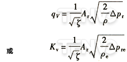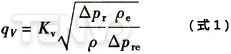 上述推導(dǎo)僅適用于同一液體的情況,被確定標(biāo)準(zhǔn)條件下的液體是水。對(duì)其他液體,比率在一般情況下是不同的,但實(shí)際上,僅當(dāng)對(duì)比液體的運(yùn)動(dòng)粘度ν大于2×10-5m2/s時(shí),或小流量調(diào)節(jié)的情況下,該液體與水的比值才有明顯差別。這些情況將引人修正系數(shù)。如果△ρre和pe有相同的數(shù)值(△pre的單位是bar,ρe的單位是kg/L),代入式中,就可得