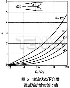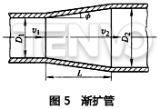 2)漸擴管。圖5為介質(zhì)通過漸擴管的簡圖。壓力損失產(chǎn)生于介質(zhì)對管壁的摩擦和流線的擴大。△p是幾何尺寸Dl、D2、L和Φ的函數(shù)。