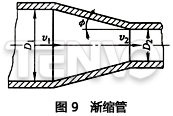4)漸縮管。如圖9所示的漸縮管,其壓力損失比突然收縮的要小,其壓力損失△p的計算如下: