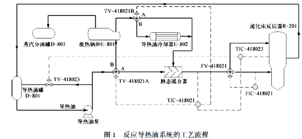 反應(yīng)導(dǎo)熱油泵把加熱后的導(dǎo)熱油經(jīng)三通閥(TV-418021A),一部分送到廢熱鍋爐(E-801);另一部分進入流化床反應(yīng)器(R-201)。兩部分的流量是由三通調(diào)節(jié)閥的閥芯同步反向調(diào)節(jié)三通閥的A、B出口的開度來分配,這種流量調(diào)節(jié)方式無節(jié)流,流阻小,作用在閥上的壓力相對較小,不會對泵產(chǎn)生背壓,使導(dǎo)熱油泵的導(dǎo)熱油流量保持恒定。若流化床反應(yīng)器的溫度發(fā)生變化,溫度信號經(jīng)控制系統(tǒng)進行運算,控制三通閥的執(zhí)行機構(gòu)帶動該閥的閥芯動作,從而改變了三通閥的A、B口的開度,達到調(diào)節(jié)流量的目的。假設(shè)R-201溫度偏高,TIC-418023調(diào)節(jié)器將起作用:一是加大進入到R-201中的導(dǎo)熱油流量,以移走R-201中更多的熱量,使溫度降下來。同時,TIC-418023還要改變調(diào)節(jié)器TIC-2418021的設(shè)定值,使其輸出變化,從而改變?nèi)ㄩy TV-418021A/B閥門的開度———首先加大進入E-801的流量,利用E-801降低進入的導(dǎo)熱油的溫度,從而降低R-201的溫度,在E- 801中,利用被加熱的導(dǎo)熱油的熱量,生產(chǎn)1.0MPa(G)的飽和蒸汽,換熱后的導(dǎo)熱油直接進入反應(yīng)器;如果出E-801的導(dǎo)熱油溫度偏高,即此時R- 201的溫度還繼續(xù)偏高,則利用導(dǎo)熱油冷卻器(E2802)處的三通閥(TV-418021B),將導(dǎo)熱油轉(zhuǎn)向旁路去導(dǎo)熱油冷卻器,E-802用循環(huán)冷卻水冷卻,即改變?nèi)ㄩyTV-418021B的B出口,進入E-802的油量加大,E-802冷卻后的導(dǎo)熱油與經(jīng)TV-418021A的主流導(dǎo)熱油在靜態(tài)混合器中充分混合后去流化床反應(yīng)器,便更多地降低導(dǎo)熱油的溫度,最終能用導(dǎo)熱油移走R-201中更多熱量,使R-201的溫度回到設(shè)定值上。由三通控制閥(FV-418021)定量控制的導(dǎo)熱油進流化床反應(yīng)器半管夾套管,余下的導(dǎo)熱油去流化床反應(yīng)器內(nèi)部指型循環(huán)管束。
