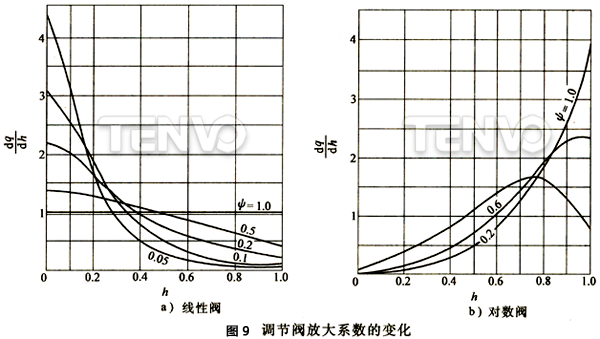 調(diào)節(jié)閥放大系數(shù)反映通過閥門的液體流量隨調(diào)節(jié)閥開度的變化,也就是導(dǎo)數(shù)d(qv/qv100)/dh,圖9示出了對于不同比率△pr100/△pso,線性調(diào)節(jié)閥和對數(shù)調(diào)節(jié)閥放大系數(shù)的變化。