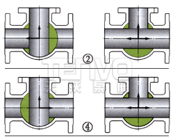 T型三通球閥適用于介質(zhì)的分流、合流或流向切換,可以使三個(gè)通道互相連通或使其中兩個(gè)通道連通,流向圖中1和4兩種工況可選用兩閥座T型結(jié)構(gòu),2和3兩種工況必須選用四閥座T型結(jié)構(gòu),其余工況也可選用四閥座結(jié)構(gòu),在選購(gòu)時(shí)必須注明。