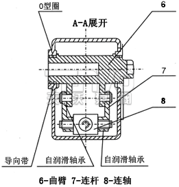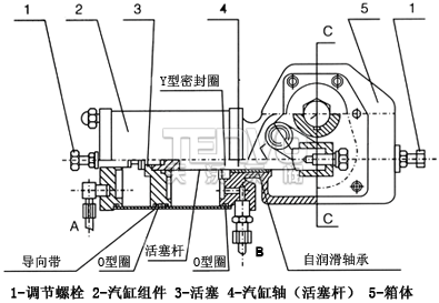 當(dāng)壓縮空氣從氣口A進(jìn)入氣缸活塞時,使活塞(3)推動活塞桿(4)向右移動,再通過連桿(7)帶動曲臂(6)作逆時針方向旋轉(zhuǎn)90度;反之當(dāng)壓縮空氣從氣口B進(jìn)入氣缸活塞時,使活塞(3)推動活塞桿(4)向左移動,再通過連桿(7)帶動曲臂(6)作順時針旋轉(zhuǎn)90度。可以從兩端調(diào)整微量角度(±50),松動螺母擰動調(diào)節(jié)螺栓(1)調(diào)整到所需角度,鎖緊螺母。